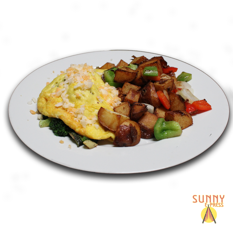 Just egg, plant base cheese, plant base bacon and 3 veggies of your choice. Served with a side of house potatoes.